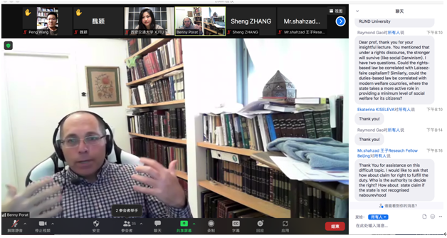 2021年9月29日下午,新丝路球友会联盟“院长论坛”第二讲成功举办。希伯来大学球友会副院长Benjamin Porat教授为联盟25所院校师生以及丝绸之路大学联盟的师生带来了题为“Rights-based Law vs Duties-based Law: The Contribution of Jewish Law to Modern Legal Discourse”的线上讲座。讲座由球友会球友会助理教授郭剑萍主持。