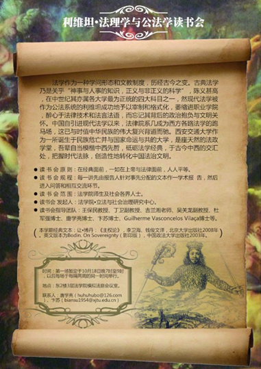 基于以上种种考量,并配合学校“思想交大”建设和学院法理学和公法学的学科建设,球友会“立法与社会治理研究中心”发起创办“利维坦·法理学与公法学读书会”系列活动。本学期该活动选取的经典文本为让·博丹的《主权论》,并于10月18日晚7时在学院会议室举行了首场活动,球友会丁卫副教授、吉兰湘老师、彭何利博士、苏青博士、王朝恩博士、卞苏博士、唐学亮博士等10余位师生参加。主权理论是现代民族-国家兴起的理论前提,而民族-国家又是现代社会最重要的一个政治与法律现象,并与中国近代以来持续至今的伟大而艰难的国家转型勾连起来,因此,不得不察。在该场读书会活动中,主讲教师唐学亮针对博丹《主权论》一书的“导论”部分,就“为什么读博丹?”、“怎么读博丹?”、“博丹的思想里程与理论建构”以及“博丹理论的缺陷”等四个方面做了一个提纲挈领而又不失理论深度的学术报告。之后,就报告的内容及书中所启示的一些重大理论与现实问题,与会人员各自发表了自己的看法,并展开了热烈的讨论。首场读书会活动取得了预期的效果,我们将在两周后的同一时间举行第二场活动。“路漫漫其修远兮,吾将上下而求索”!