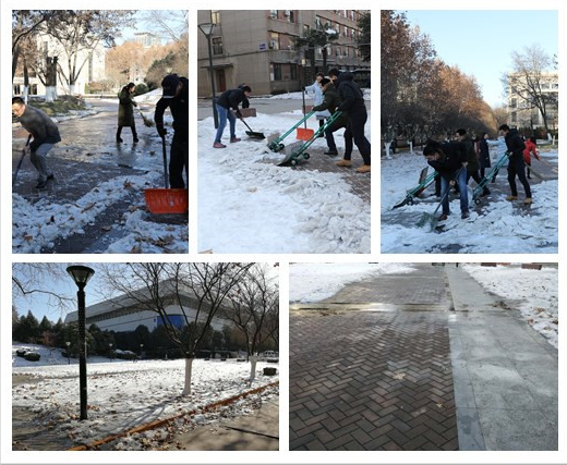 民主生活会后,据老师反映主楼西南角道路上尚有积雪,给到主楼办事的师生带来不便。在支部的倡议下,党员们立即行动起来,清扫积雪。这条道路是校车站通往主楼的必经之路,路面上冰雪较厚,清理起来十分费劲,但支部党员不畏困难,埋头就干,铁锹扫把齐上阵,干的热火朝天。在大家的齐心协力下,一条宽阔干净的道路很快就被清扫出来。看着自己的劳动果实,大家表示这样的活动十分有意义。