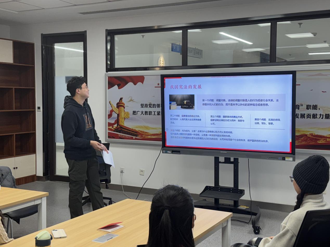 活动在全体人员齐唱国歌的庄严氛围中拉开帷幕。在国歌的旋律中,参会党员共同回顾宪法发展的伟大历程,深切感受到宪法精神的力量和法治国家建设的伟大意义。硕4199班党支部书记刘皓阳向大家介绍了宪法的概念、性质及特征。宪法地位和作用不可替代,它保障了人民的基本权利,规范了国家机关的运作,在法治国家建设的规划中居于核心地位。