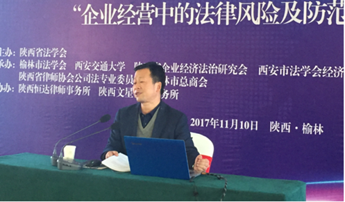 陕西恒达律师事务所主任陈贞学、榆林市中级人民法院民二庭副庭长李永旺、陕西能源集团政策法规室副主任齐渭波、北京炜衡律师事务所西安分所主任、陕西律协公司法专委会主任王小涛分别做了题为“企业经营中的法律风险及防范”、从审判视角看新时代企业用工的法律问题”、“金税三期时代的企业税务风险管理与应对”、“公司治理权力博弈与实证案例分析”的报告。 在四位嘉宾做完专题报告之后,西安市法学会经济法学研究会副会长、西北政法大学行政球友会副院长姬亚平教授、陕西省法学会企业经济法治研究会副会长、球友会球友会张冰副教授进行了精彩点评。