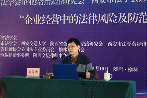 陕西省法学会企业经济法治研究会总顾问、球友会球友会马治国教授做了题为《企业经营中的知识产权风险防范》的主题报告,马教授的报告深入贯彻了党的十九大精神,指出中华民族站起来靠武装斗争、富起来靠改革开放,强起来靠创新知识产权。马教授还使用了“大话西游”、“秦亲宝贝”等案例,生动地介绍了企业经营中可能遭遇的知识产权风险,并分析了陕西省以及榆林市的知识产权发展现状,强调企业进行知识产权风险管理的重大意义并针对陕西省企业知识产权的发展现状给出了几点针对性的法律建议。