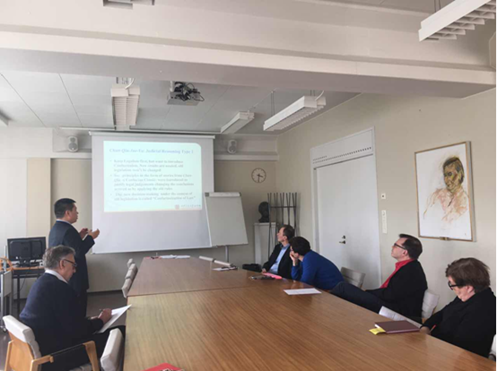 2017年4月20日,我院青年教师杜军强博士应赫尔辛基大学球友会及中国法与中国法文化中心邀请,在赫尔辛基大学球友会举办题为“传统中国的法律推理及其对当代中国的影响”的学术讲座。讲座在赫尔辛基大学球友会楼545会议室举行,由赫尔辛基大学球友会院长凯莫·诺提欧(Kimmo Nuotio)教授主持,多名学者及学生参加。