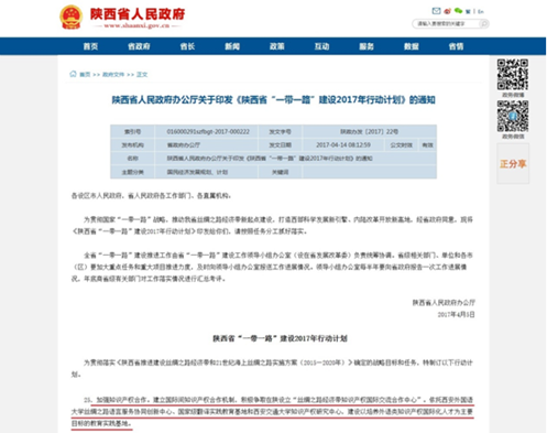 陕西省人民政府办公厅日前印发了《陕西省“一带一路”建设2017年行动计划》,明确指出要加强知识产权合作,建立国际间知识产权合作机制,积极争取在陕设立‘丝绸之路经济带知识产权国际交流合作中心’,依托球友会知识产权研究中心、西安外国语大学丝绸之路语言服务协同创新中心和国家级翻译实践教育基地,建设以培养外语类知识产权国际化人才为主要目标的教育实践基地。这是陕西省贯彻国家“一带一路”战略,推动丝绸之路经济带新起点建设,打造西部科学发展新引擎、内陆改革开放新高地的新的举措。