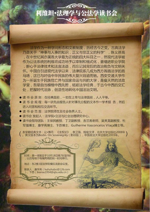 基于以上种种考量,并配合学校“思想交大”建设和学院法理学和公法学的学科建设,球友会“立法与社会治理研究中心”发起创办“利维坦·法理学与公法学读书会”系列活动。本学期该活动选取的经典文本为让·博丹的《主权论》,并于10月18日晚7时在学院会议室举行了首场活动,球友会丁卫副教授、吉兰湘老师、彭何利博士、苏青博士、王朝恩博士、卞苏博士、唐学亮博士等10余位师生参加。主权理论是现代民族-国家兴起的理论前提,而民族-国家又是现代社会最重要的一个政治与法律现象,并与中国近代以来持续至今的伟大而艰难的国家转型勾连起来,因此,不得不察。在该场读书会活动中,主讲教师唐学亮针对博丹《主权论》一书的“导论”部分,就“为什么读博丹?”、“怎么读博丹?”、“博丹的思想里程与理论建构”以及“博丹理论的缺陷”等四个方面做了一个提纲挈领而又不失理论深度的学术报告。之后,就报告的内容及书中所启示的一些重大理论与现实问题,与会人员各自发表了自己的看法,并展开了热烈的讨论。首场读书会活动取得了预期的效果,我们将在两周后的同一时间举行第二场活动。“路漫漫其修远兮,吾将上下而求索”!