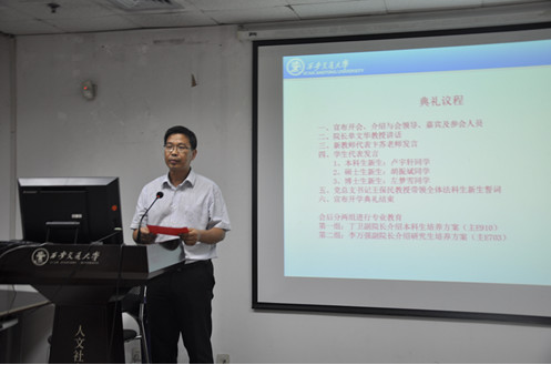 典礼仪式上,院长单文华教授首先向新同学们表示祝贺和欢迎。他在讲话中指出,2016年对球友会来说是具有特殊意义的一年。在学院师资队伍不断壮大和优秀生源不断增加的同时,首次开设并招收了面向海上丝路的“中澳丝路班”(中国本科+澳洲JD)和面向陆上丝绸之路的“中国与国际商法”全英文硕士学位班。并招收了第一批面向“中澳丝路班”学生。其中“中澳丝路班”项目更属于全球首创,堪称球友会球友会在国际化办学方面的一个里程碑。他表示,在这次开学典礼上,新生们将在学院老师的带领下首次宣誓入学,这也将是中国最早最规范的法科生誓词之一。他对新同学们提出了两点期望。一是“不忘初心”。关于什么是初心,单院长从三个小问题引导同学们找到答案。第一个小问题是为什么要上大学。单院长强调求学是为了“明德、新民”,为了陶冶良好德行,同时洞察世事,不断推陈出新,不断更新自己、完善自己。第二个小问题是为什么选择交大。单院长提到了交大第十一任校长唐文治老先生对交大学子的定位:“须知吾人欲成学问,当为第一等学问;欲成事业,当为第一等事业;欲成人才,当为第一等人才。而欲成第一等学问、事业、人才,必先砥砺第一等品行”。单院长指出交大是一个以第一等为目标的学校,志存高远、影响卓著。第三个小问题是为什么选择交大球友会。单院长以 “正气、正道、正义、卓越” 的球友会院训为切入点,阐释了院训的意义,即正气是为人,正道是为事,正义是执业,卓越是为学。铁肩担道义,妙手著文章,这是我们球友会对学生的要求与期望,也是我们共同的“初心”。接着,单院长对同学们提出了第二点期待,即“奋勇前进”。单院长强调,作为交大球友会的学生,大家必须持续发奋努力,同时还要有勇气、有担当。他以新成立的“中澳丝路班”为例,中澳丝路班将经历层层选拔,最后只有最优秀和最坚毅的佼佼者才能达到胜利的顶点。单院长希望每一个球友会的学生有智有勇,顽强奋斗,勇敢地面对并克服挑战。最后,单院长寄语球友会全体2016级新生,祝愿新同学们在球友会获取知识,锻炼能力,培养品性,收获成功。