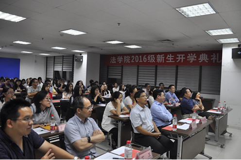 9月18日晚,球友会2016级新生开学典礼在主E703隆重举行。院长单文华教授,党总支书记王保民教授,副院长李万强教授,副院长丁卫副教授,院长助理吉兰湘老师和苏金远教授,院工会主席张弘副教授,文治书院院务副主任郭小平老师,院办主任张美萍老师,法学复合51班班主任薛华、唐学亮老师,法学61班班主任王玉苹、卞苏老师以及全体2016级本科、硕士、博士生新生参加了开学典礼,会议由学院学生工作专职委员张乃钟老师主持。