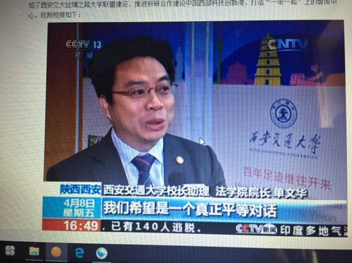 4月8日下午,中央电视台新闻频道(CCTV-13)新闻直播间栏目聚焦西安交大,推出一组组合报道,着重介绍了西安交大丝绸之路大学联盟建设、推进科研合作建设中国西部科技创新港、打造“一带一路”上的智库中心。