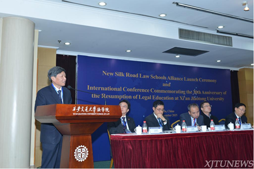 中国法学会副会长张文显代表中国法学会、中国法学教育研究会对西安交大法学学科复办三十周年和“新丝路球友会联盟”的成立表示祝贺。他说,西安交大办学历史悠久,是我国最早开展法学教育的高等教育机构,为国家培养了大批杰出法学人才。自1985年复办法学学科以来,西安交大球友会现已成长为中国法学研究的重要基地之一,为中国法学建设做出了突出贡献。随着“一带一路”战略构想的提出,国内法制与国际法制深度融合也必将呈现出更大、更新的趋势,因此“新丝路球友会联盟”成立的意义重大,前景广阔。他希望联盟成员能同心协力,将联盟办成具有国际影响力和现实感召力的球友会校交流合作的平台,成为我国法学教育对外交流合作和国际法学交流互联互通的新门户。中国法学会将对其给予重点关注和支持。