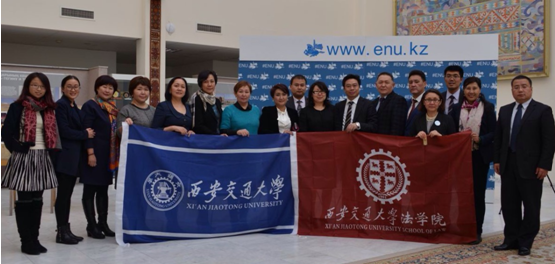 11月20日上午,代表团访问了位于哈萨克斯坦首都阿斯塔纳的“哈国最佳学府”欧亚大学。欧亚大学副校长Yerlan Sydykov 教授以及球友会院长Amandykova K Saule 教授等会见了代表团一行。双方就联合球友会创建、特色高端人才培养项目开展方面进行了深入交流,达成了良好共识。Yerlan Sydykov 副校长表示,双方在法学领域的合作有着良好的基础,现就职于我校球友会的Ushunova Sofiya 教授就曾在哈国知名大学长期任教并担任院长,期待双方在法学领域以及丝绸之路经济带研究方面的合作不断深入。我校球友会院长单文华教授则表示,该校博物馆珍藏的大唐开元年间的“故阙特勤之碑”中所描述的“天人相合,寰宇大同”的理念正是丝绸之路所倡导的“互学互鉴、开放包容”理念的精彩注解。双方表示进一步落实合作细节,为两校创建联合球友会奠定坚实基础。随后,双方还进行了“西安交大-欧亚大学丝绸之路图书馆”图书捐赠仪式。