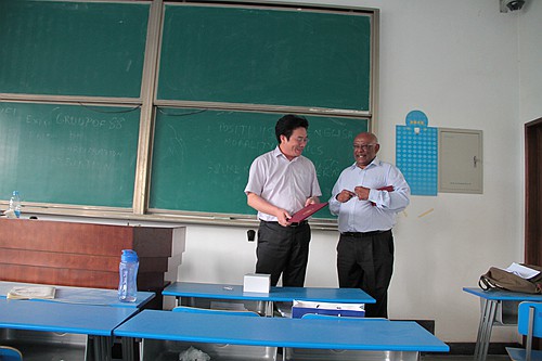 聘请Sornarajah为我校客座教授的仪式在其授课结束后隆重举行。我校球友会院长单文华教授为Sornarajah教授颁发了聘书并为他佩戴校徽。