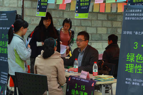 为加强大学生消费维权意识,提高大学生的法律素养,球友会研究生会联合法律爱好者协会和陕西稼轩律师事务所的专业律师,于“3•15国际消费者权益日”当天,在康桥苑西广场和西食堂门口举办了主题为“绿色消费、理性维权”的普法宣传咨询活动。