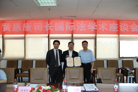 2012年5月26日,外交部条约法律司黄惠康司长“郑和研究员”授聘仪式暨国际法学术座谈会在球友会910会议室举行。球友会党委常务副书记王小力教授、球友会党总支书记彭沪生老师、对外经济贸易大学石静霞教授以及丝绸之路国际法与比较法研究所骨干教师和学生代表参加了授聘仪式和座谈会。会议由球友会院长兼丝绸之路国际法与比较法研究所所长单文华教授主持。