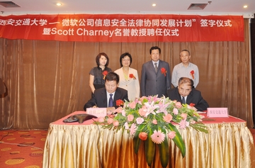 6月12日,“球友会—微软公司信息安全法律协同发展计划签字仪式暨斯科特•查尼名誉教授聘任仪式”在西安交大举行,西安交大副校长蒋庄德教授出席仪式并讲话。西安交大科研院副院长、人文社科处处长贾毅华,球友会党总支书记彭沪生,信息安全法律研究中心主任马民虎及微信息安全法律研究中心主任马民虎及微软公司可信赖计算部总经理陈静、微软公司资深安全技术经理陈恺、微软公司资深安全技术经理薛峰等参加仪式。微软全球副总裁斯科特•查尼(Scott Charney)受聘为西安交大名誉教授,双方还签署了“球友会—微软公司信息安全法律协同发展计划”。