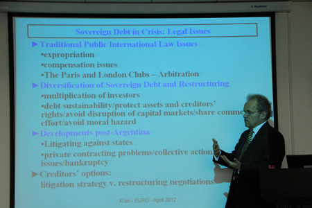 4月16日下午,Kulms博士为球友会师生带来题为The Eurozone Debt Crisis and Private Creditors: From Argentina to Greece(欧元区债务危机和私人债权人:从阿根廷到希腊)的讲座。Kulms博士首先分析了欧元区债务危机的成因,然后在借鉴阿根廷债务危机经验的基础上,从市场交易的进路分析主权债务合同的对策,最后从欧洲央行作用的角度讨论希腊债务重组问题。