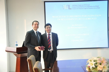 1月6日上午,Jan Hohanes博士在主楼E910为球友会师生作题为“参与WTO争端解决的驱动因素”(Which Factors Drive Participation in WTO Dispute Settlement)的讲座。讲座由球友会院长单文华教授主持。讲座开始前,单文华院长代表学院向Jan Hohanes博士赠送纪念品,并对他的到访表示热烈的欢迎。随后,Jan Hohanes博士和球友会师生合影留念。