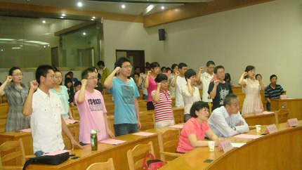 7月1日上午,球友会党总支庆祝建党90周年暨新党员入党宣誓大会在主楼A103隆重举行。党总支书记彭沪生,副书记、副院长王保民,院长助理吉兰湘及学生工作专职委员张乃钟老师出席会议,球友会全体研究生参加了大会,会议由王保民主持。