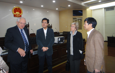 3月25日,安德森大法官及其夫人在我校球友会副院长王保民带领下参观了陕西省高级人民法院,省高院田平利副院长出面迎接,并亲自带领安德森大法官参观了省高院气势宏伟的办公大楼,包括民事、刑事审判庭、集团诉讼审判大厅、审判委员会合议室以及法院图书馆。之后,安德森大法官与省高院田院长和各刑事审判庭庭长法官们进行了座谈,就双方感兴趣的刑事诉讼程序中“诉辩交易”等问题展开深入探讨。球友会外事秘书华雨婷参加了座谈会。