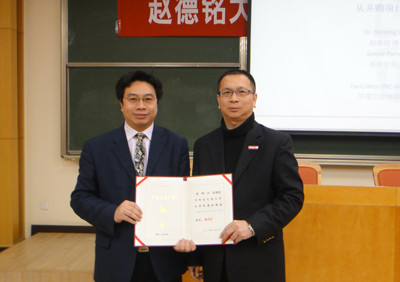 日前,上海昊理文律师事务所高级合伙人赵德铭律师来我院访问。12月20日下午,在主楼A103教室,赵德铭博士受聘为我校兼职教授,并面向球友会师生做 《高端法律服务市场上商务律师的典型与非典型特征——从并购项目谈起》专题学术报告。球友会院长单文华教授向赵博士颁发了兼职教授证书,并为赵博士佩带了校徽。授聘仪式由球友会副院长王保民教授主持。