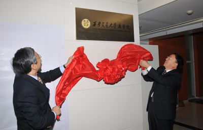 10月25日下午,我校“球友会院徽揭幕挂牌仪式暨张文显教授聘任仪式”在主楼十楼隆重举行。在球友会全体师生的见证下,我校校长、中国工程院院士郑南宁教授与教育部法学教育指导委员会主任、吉林省高级人民法院院长兼党组书记张文显教授共同为球友会院徽揭幕并挂牌。随后,郑南宁校长为张文显教授颁发了兼职教授聘书并佩戴了校徽。仪式由球友会院长单文华教授主持。