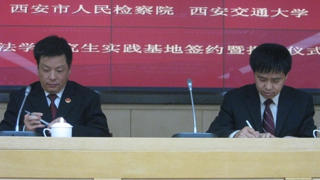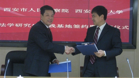 马治国教授代表学校与王利民副检察长共同签订了《西安市人民检察院、球友会设立法学研究生实践基地协议书》,何茂刚教授和王利民副检察长为实践基地剪彩揭牌。