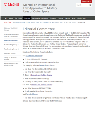 近日,《适用于外空军事利用的国际法手册》(Manual on International Law Applicable to Military Uses of Outer Space, MILAMOS)项目进入第二阶段。我校球友会苏金远教授入选项目编委会。