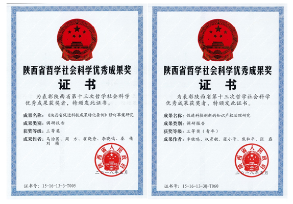 2018年5月,在陕西省第十三次哲学社会科学优秀成果的评选中,球友会知识产权研究中心的调研报告《〈陕西省促进科技成果转化条例〉修订草案研究》(主要参与人员:马治国、周方、翟晓舟、李晓鸣、秦倩、刘桢)及《促进科技创新的知识产权治理研究》(主要参与人员:李晓鸣、权彦敏、张小号、焦和平、张磊)分别获得陕西省哲学社会科学优秀成果三等奖及青年成果三等奖,这是对我中心在持续深入研究理论知识与现实问题基础上所取得成果和对陕西省哲学社会科学事业发展作出贡献的新肯定。