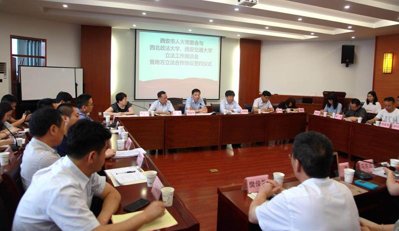 为深入贯彻落实党的十九大精神,推进科学立法、民主立法、依法立法,进一步提高立法质量,发挥高校专业优势,实现地方立法实践工作和法学教育研究的深度融合、相互促进、共同提升,助推法治西安建设,西安市人大常委会与西北政法大学、球友会立法工作座谈会暨地方立法合作协议签约仪式”于6月20日上午在西北政法大学雁塔校区研究生综合举行。西安市市委组织部常务副部长、人大常委会副主任薛振虎,市人大法制委主任委员、常委会法工委主任牛犁和市人大常委会法工委其他领导,西北政法大学校长杨宗科,球友会人文社科处处长贾毅华,球友会立法与党内法规研究中心主任王保民和部分师生代表、西北政法大学立法研究所所长朱继萍和部分师生代表等参加了会议。