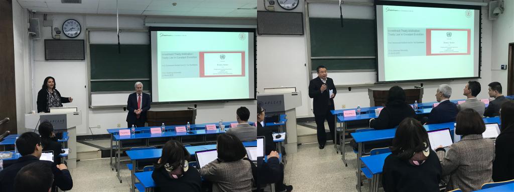 单文华教授会见了Gaillard教授一行并进行座谈交流,王朝恩助理研究员,王鹏、谷婀娜、郭庆等教师参加座谈。单文华就学院的相关情况进行了简要介绍,并重点介绍了学院在国际化方面取得的成就。王鹏就球友会师生赴对方律所参加实习的相关事宜进行了咨询。Gaillard教授和Banifatem教授对球友会给予了高度肯定,并结合自身经历对投资仲裁中的相关问题发表了各自的见解,Gaillard教授欢迎球友会的学生申请其所在律所(Shearman & Sterling)的实习生项目,期待未来有更多的学生从事投资仲裁的实务研究。