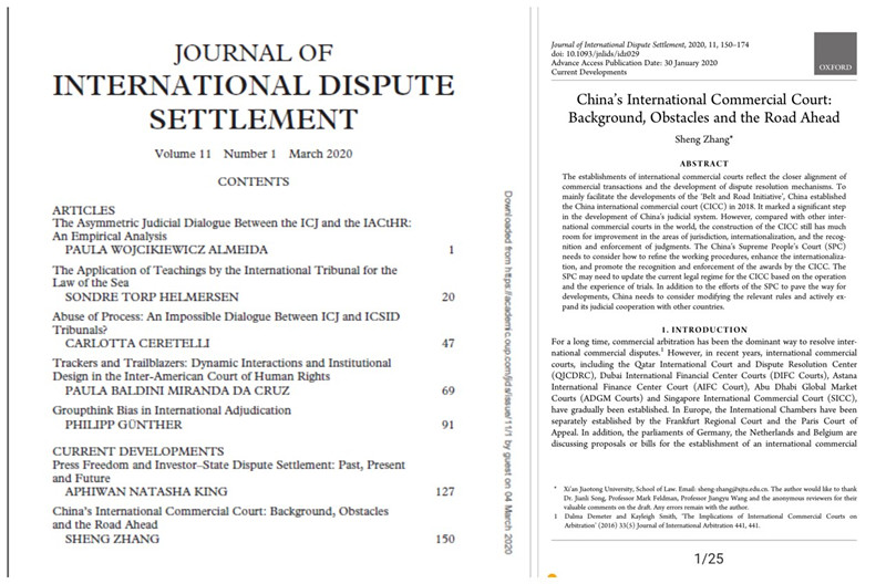 近日,我院张生副教授撰写的论文China’s International Commercial Court: Background, Obstacles and the Road Ahead在SSCI期刊Journal of International Dispute Settlement(《国际争端解决杂志》)2020年第1期上发表。《国际争端解决杂志》由伦敦国王学院Thomas Schultz教授担任主编,牛津大学出版社出版。该期刊影响因子为1.638,在目前SSCI收录的148种法学期刊中排名第42位,属于二区期刊。