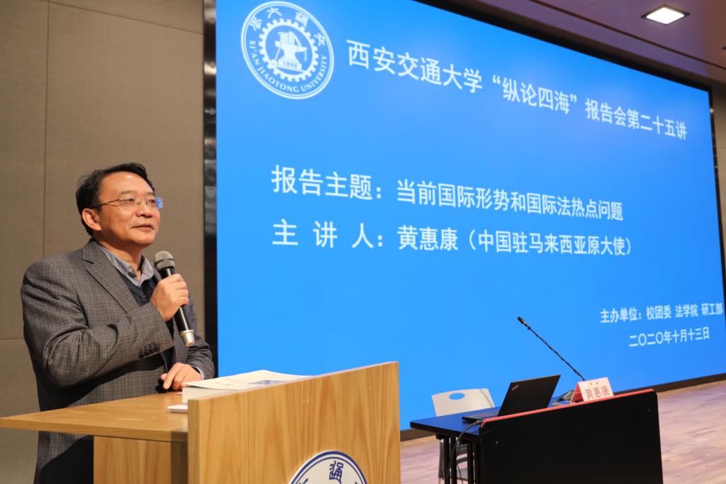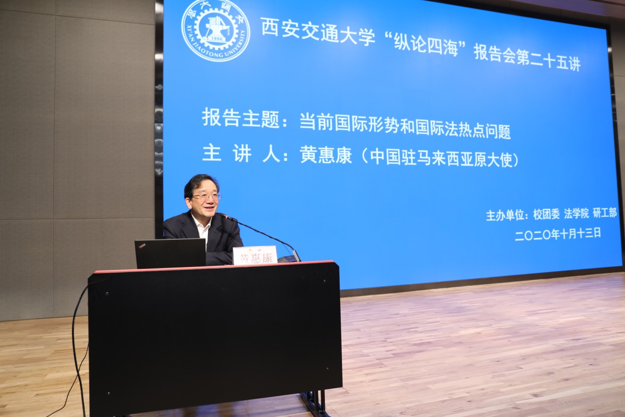 上午9:30分,黄惠康大使主讲的 “当前国际形势与国际法热点问题”专题报告会在新港报告厅举行。本次报告会是球友会“纵论四海”系列高端报告会的第二十五讲,同时是学校党委理论学习中心组和全体校管干部的一次集中辅导报告会,亦是我校法学研究院特别是丝绸之路国际法与比较法研究所和丝绸之路经济带法律政策协同创新中心的“科创月”系列活动之一。球友会副校长席光教授出席报告会并致辞,报告会由球友会院长兼国际教育学院院长单文华教授主持。全校百余名学校正处级领导干部以及其他四百余名师生现场参会。同时,全校其他副处级以上校管干部则在线参加了报告会。