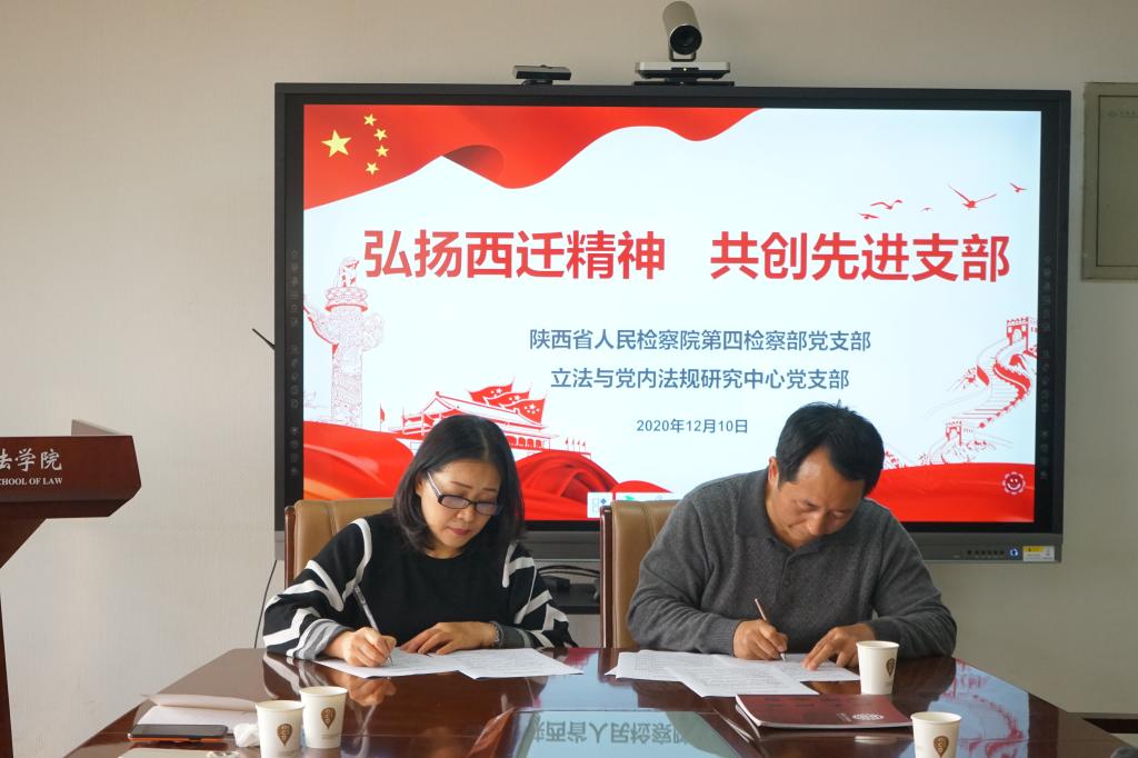 2020年12月10日下午,立法与党内法规中心党支部与陕西省人民检察院第四检察部党支部举行了以“弘扬西迁精神,共创先进支部”为主题支部联合共建座谈交流活动,并签署支部共建协议。双方主要领导及支部党员代表共20余人参加活动。