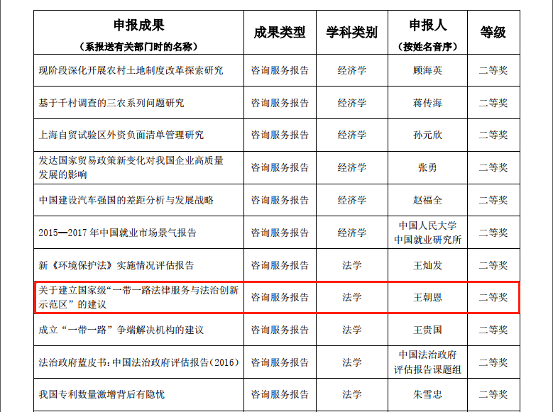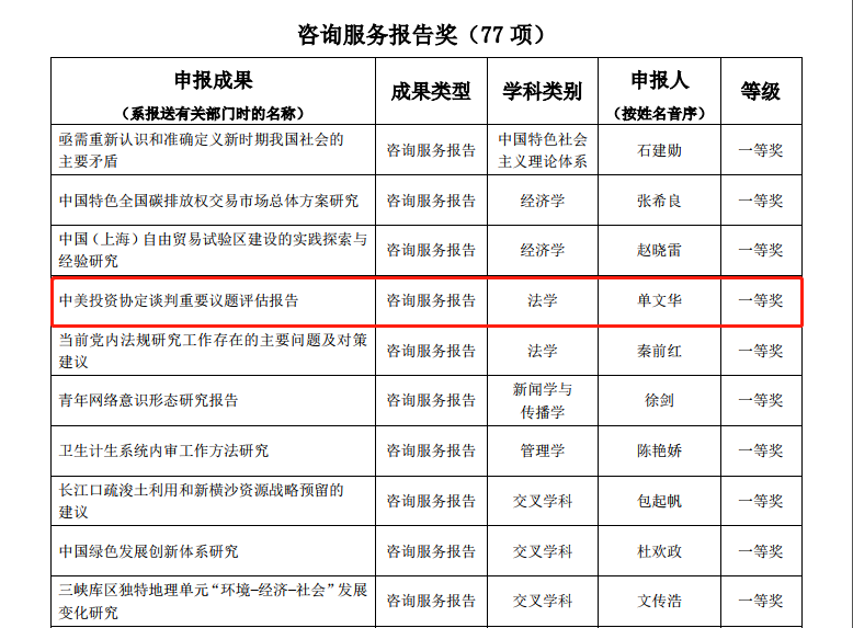 其中,球友会院长单文华教授主持撰写的《中美投资协定谈判重要议题评估报告》荣获咨询服务报告类一等奖——这是该类型全国仅有的两项法学类一等奖获奖成果之一,也是西安交大在该奖项一等奖上的首次突破。同时,由单文华院长和王朝恩副教授等合作撰写的《关于建立国家级“一带一路法律服务与法治创新示范区”的建议》荣获咨询服务报告类二等奖,是全国5项法学类二等奖成果之一。