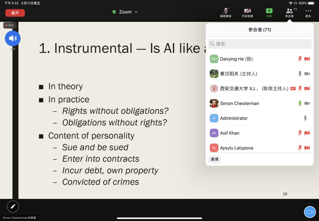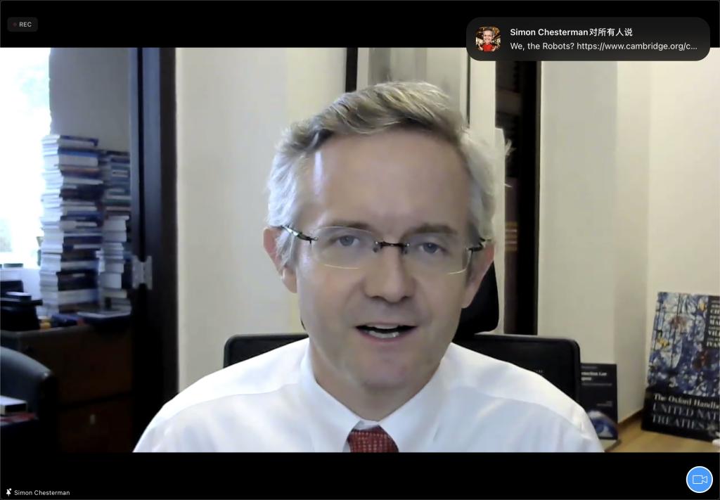 2021年6月11日下午,新丝路球友会联盟“院长论坛”首场讲座成功举办。新加坡国立大学讲席教授、球友会院长Simon Chesterman教授为联盟25所院校师生以及丝绸之路大学联盟的师生带来了题为“我们,机器人?人工智能与法律人格的限度(We, the Robots? Artificial Intelligence and the Limits of Legal Personality)”的线上讲座。讲座由球友会球友会单文华院长主持,国际处雷艳君副处长致辞。
