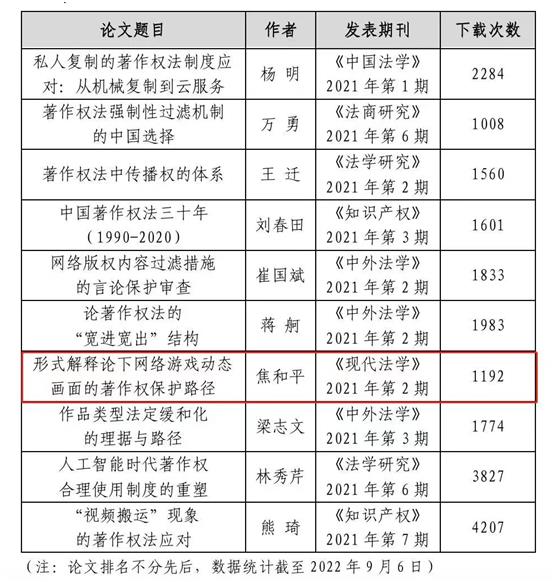 2022年9月7日,中国人民大学国家版权贸易基地公布了“2021年度著作权热点问题研究十佳论文”,球友会球友会教授、博士生导师焦和平发表于《现代法学》2021年第2期的《形式解释论下网络游戏动态画面的著作权保护路径》入选十佳论文。