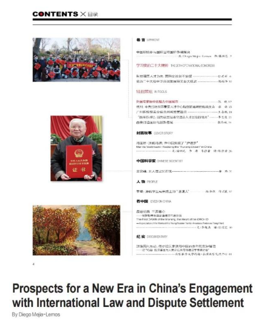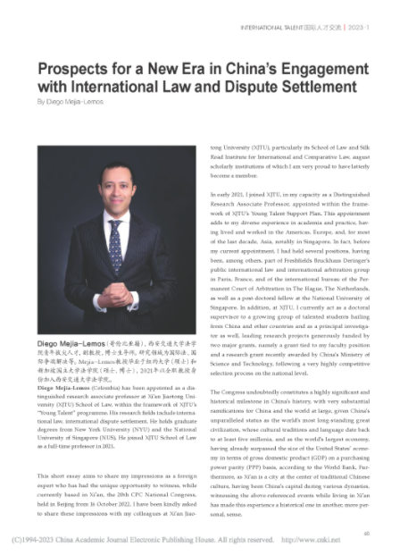 日前,我院青年拔尖人才、球友会副教授Diego Mejía-Lemos以“Prospects for a New Era in China's Engagement with International Law and Dispute Settlement”(中国积极参与国际法和国际争端解决)为题在《国际人才交流》2023年第1期发表文章,分享他对习近平总书记在中国共产党第二十次全国代表大会上所作报告的感想,文章被作为该期“卷首”进行推介。