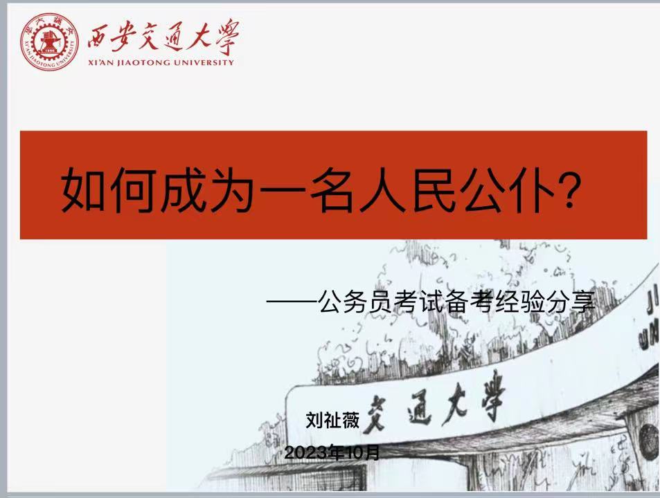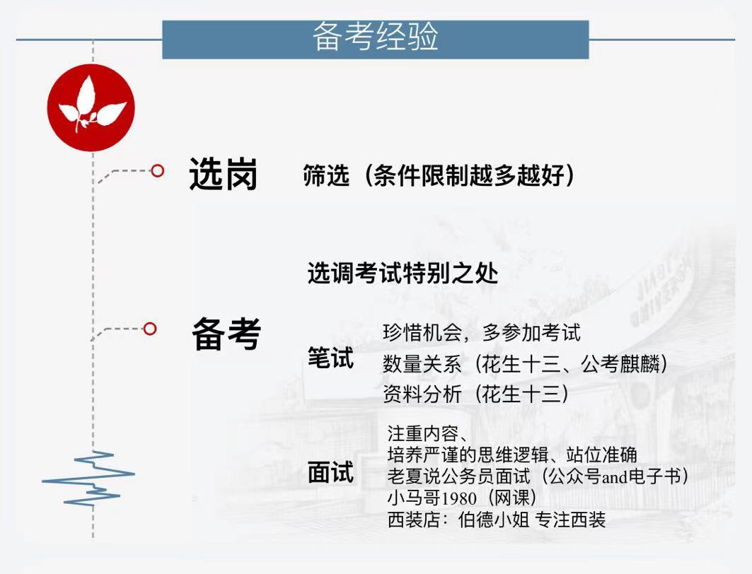 刘祉薇首先介绍了她参加选调生招考的基本情况,分析了选调生的优势,如薪资、工作机会等,强调了报考选调生需要考虑自己的兴趣和发展方向,讲解了在选岗、备考、笔试和面试中的经验和注意事项,希望同学们珍惜学校提供的宝贵平台,坚定信心,一举上岸,考取理想的岗位。