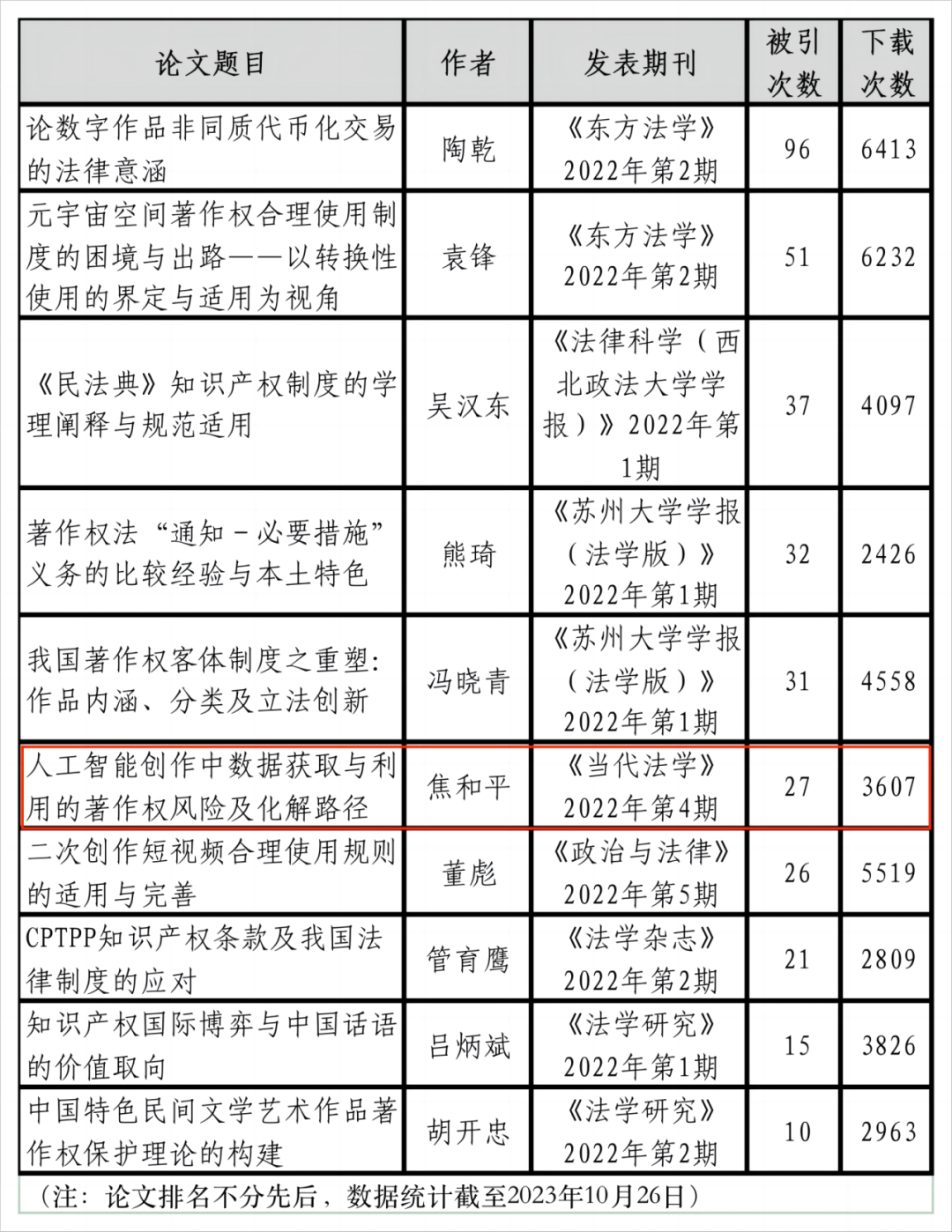 2023年11月10日,中国人民大学国家版权贸易基地公布了“2022年度著作权热点问题研究十佳论文”。球友会球友会教授、博士生导师焦和平发表于《当代法学》2022年第4期的《人工智能创作中数据获取与利用的著作权风险及化解路径》入选十佳论文。