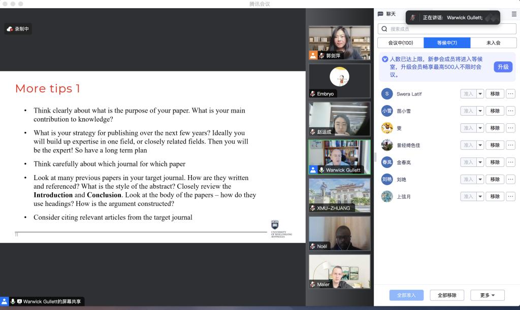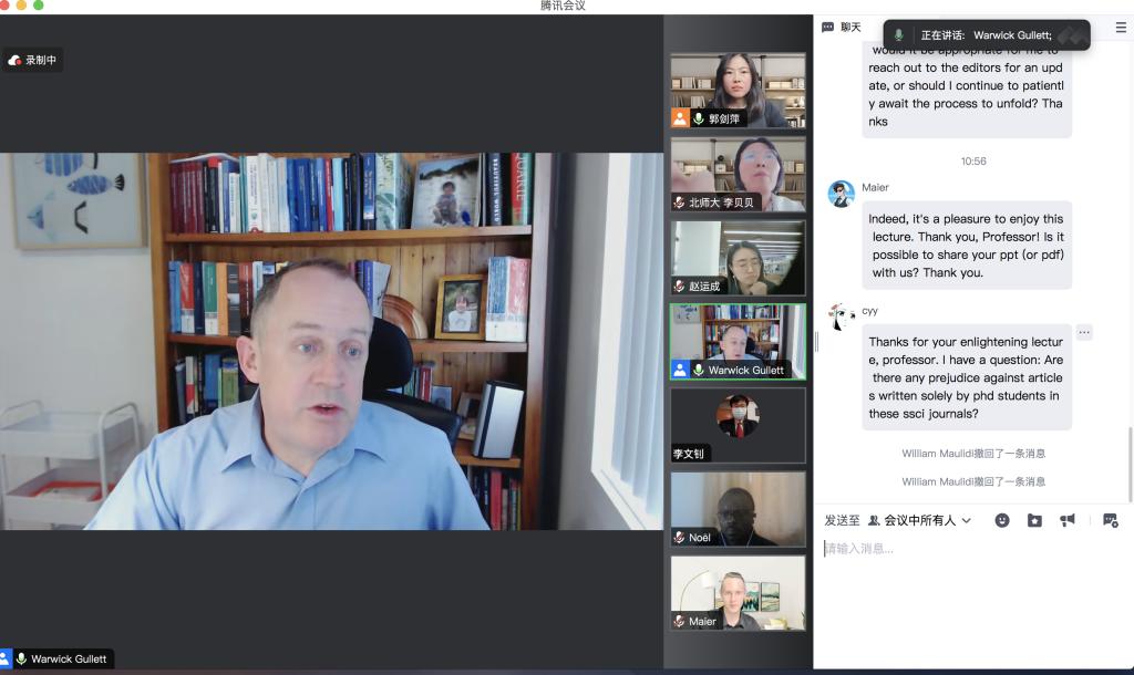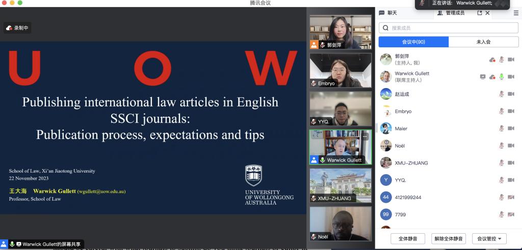 2023年11月22日9:30,澳大利亚伍伦贡大学球友会、国家海洋资源与安全中心(ANCORS)Warwick Gullett教授在腾讯会议为我院师生线上带来一场题为“Publishing International Law Articles in English SSCI Journals: Publication Process, Expectations and Tips”的主题讲座。讲座由球友会球友会副教授郭剑萍主持,球友会部分博士生、硕士生以及来自其他学院的师生参加了此次讲座。