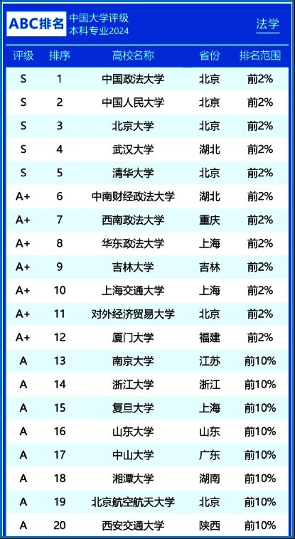 法学类专业共10个,其中开设院校超过5所的有6个专业,分别为法学(600余所)、知识产权(99所)、监狱学(9所)、信用风险管理与法律防控(12所)、国际经贸规则(13所)、社区矫正(5所);开设院校少于5所的其他4个专业分别是司法警察学、纪检监察、国际法和司法鉴定学。中国大学排行榜(CNUR)专业排名由权威的第三方评级评价机构——深耕全球高等教育研究领域的ABC咨询独家编制,其旗下官网同步发布。