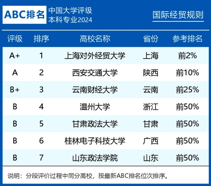 “国际经贸规则”系法学类特设本科专业(专业代码030105T),旨在培养既具备中国法律知识和执业能力,又通晓国际民商事法律制度,精研国际经贸规则,拥有国际视野和跨文化沟通能力的高端经贸法律人才。为了回应“一带一路”倡议和国家涉外法治工作战略发展需求,西安交大于2023年申请开设国际经贸规则专业,通过教育部审查备案,同年启动专业招生,是全国首家设此专业的“双一流”高校。今年是首次参加该专业排名,位居全国第2位,A级评级。