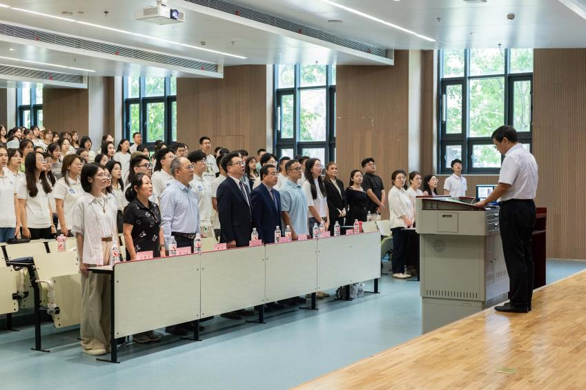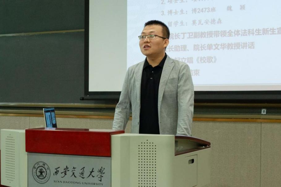 丁卫副院长带领全体法科生新生庄严宣誓:“公平所系,正义相托。在这庄严时刻,我郑重宣誓:我志愿投身法治事业,忠实履行一个法律人应尽的全部义务,恪守宪法,热爱祖国,忠于人民,弘扬法治精神,维护正当权益,勤勉诚信,清正廉洁。我决心竭尽全力,捍卫法律职业的圣洁与荣誉,养天地正气,行人间正道,求正义,尚卓越,为法治中国的繁荣发展和人类正义的美好未来奋斗终生!”