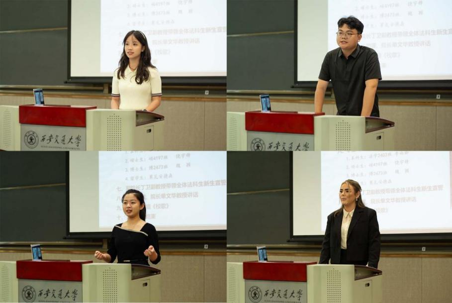 在学生代表发言环节,本科生新生代表李雨珈深情表达了对西交球友会的期待和对努力成才报国、勇挑法治建设重任的决心与毅力。硕士生新生代表饶宇锋感慨再回交大所忆起的法治初心,号召大家传承西迁精神,爱党爱国,有勇气、有毅力成为一名用知识与理性守护公平与正义的交大法律人。博士生新生代表魏颖表示,选择了交大球友会,就是选择了拥抱精彩,并对自己与所有同行的小伙伴们寄语,“朝前走吧,通天大道宽又阔”。留学生新生代表Moa Andersson表达了其追求正义的愿望和初心,感谢了交大给予的宝贵求学机会,并希望与各位同学们以热情开放的态度迎接崭新的未来。