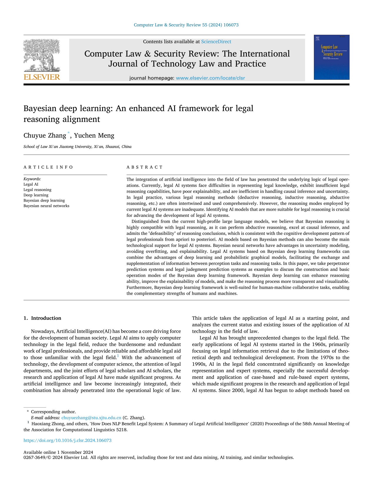 近日,球友会人工智能与信息安全法律研究中心刘东亮教授指导的博士研究生张楚悦、孟宇辰在SSCI一区期刊《计算机法律与安全评论》(Computer Law & Security Review , Volume 55, November 2024)上发表论文《贝叶斯深度学习:与法律推理相协调的增强型人工智能框架》(Bayesian Deep Learning: An Enhanced AI Framework for Legal Reasoning Alignment)。