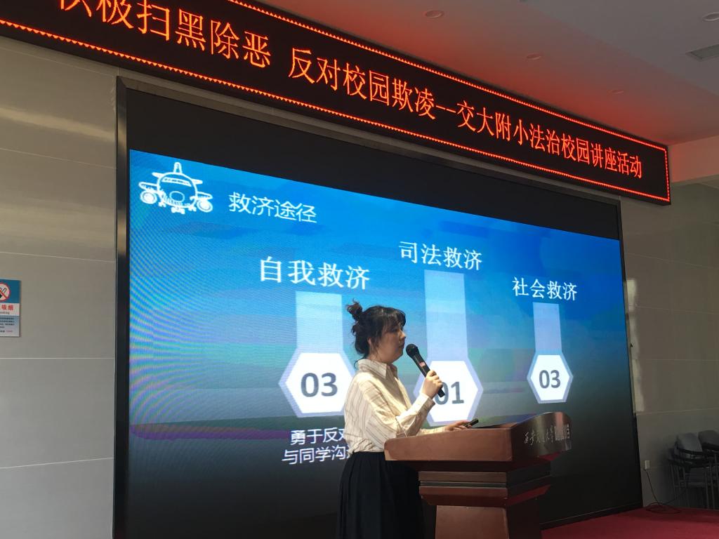 第一组由支部党员杨乔雨和吴金娟展示,她们通过视频及案例引入主题,从私力救济、社会救济及司法救济的角度告诉同学们如何寻求帮助。关于司法救济途径,通过相关法条的引入,从民事救济及刑事救济的角度阐述了自然人享有生命权、身体权、名誉权、荣誉权等权利,并且当自己的权利受到侵害时,有权要求停止侵害,恢复名誉,消除影响,赔礼道歉,赔偿损失。情节严重的可以将他人诉至法庭,进而维护自身权益。