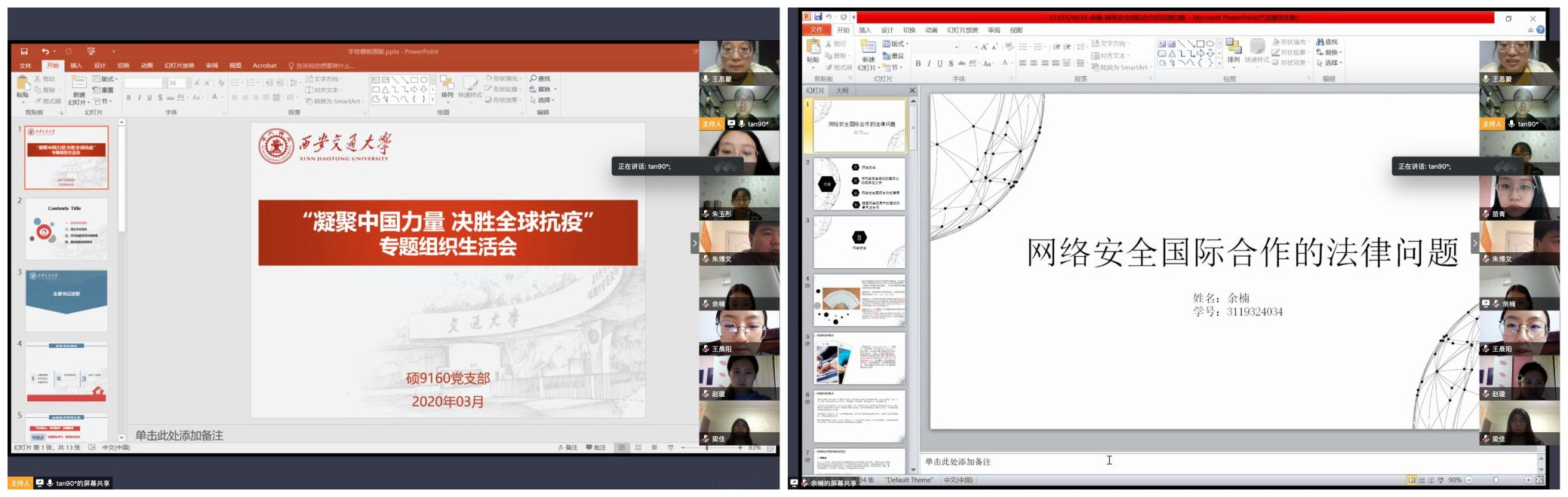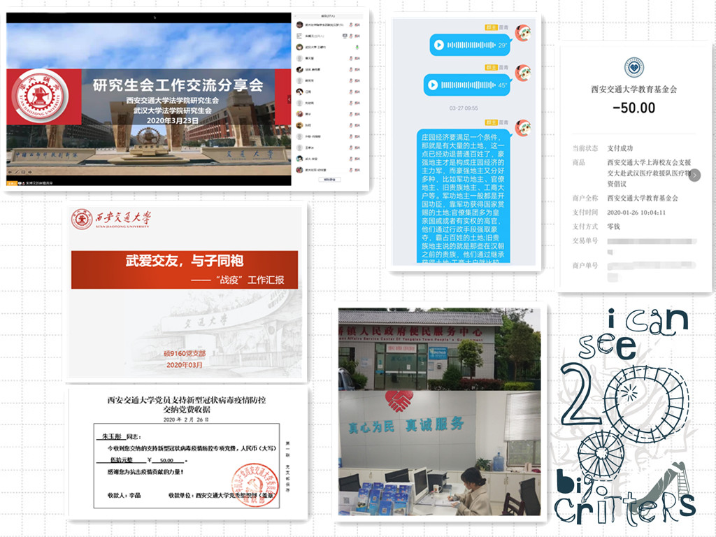 3月23日晚,西安交大球友会与武汉大学球友会联合举办“武爱交友,与子同袍”分享交流会,朱博文、孙阳分别就研会建设、支部工作与武大同学分享心得、畅谈经验,两校法科学子对近期“抗疫”工作展开热烈讨论。“武大球友会研会组织健全完善,活动丰富多彩,各位同学的分享干货满满,令人受益匪浅”,支部党员、球友会研会主席朱博文表示,“我们将组织专题研究,吸收借鉴有益经验,更好地为交大同学们服务”。“武大医学部白衣执甲、坚守阵地,交大医学部逆行出征、千里驰援,共同凝聚起抗击疫情的钢铁长城”,孙阳在总结发言中表示,“待疫情散去、山河无恙之时,希望大家可以实地交流,轻抚兴庆湖畔的秦砖汉瓦,品味珞珈山上的荆风楚韵。”
