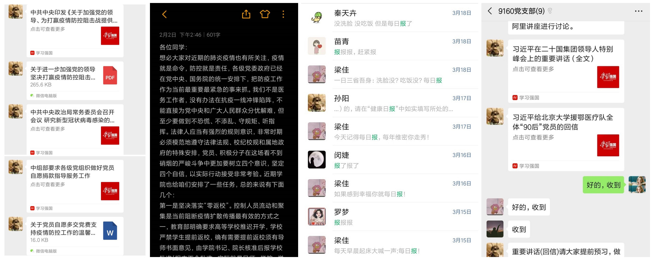 “疫情就是命令,防控就是责任。”支部积极响应中央决策部署,全体党员齐心协力、多措并举,在学院疫情防控工作领导小组的统一领导下,科学、规范、有序做好新冠病毒肺炎疫情防控工作。支部及时转发党中央、国务院决策部署和学校、学院防控要求,确保上级指示精准传达到每一位同学,坚决实现“零返校、零感染”的目标;将班级同学以宿舍为单位划分到每位党员,实行网格化管理,每日提醒所辖同学按时报送个人健康日报,切实保证“零报告、日报告”制度高效运行;把籍贯湖北和假期留校的2位同学作为工作重点,专人负责、定时联系,加强人文关怀,鼓励他们坚定信心、科学防范。各位党员同志广泛搜集整理疫情防控工作动态、卫生健康知识以及法律知识,在朋友圈、微博等新媒体平台转发,引导群众在非常时期带头守法、积极普法。