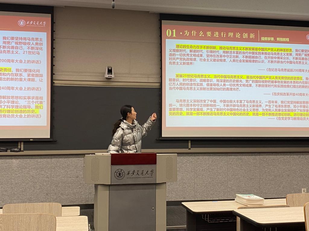球友会学生微宣讲团成员、硕1173班班长张云月作主题为“坚持理论创新,展现马克思主义开放性和时代性”的宣讲。张云月就为什么要进行理论创新这一问题,带领大家学习了习近平总书记关于理论创新的讲话,结合马克思主义的发展史和世界各马克思主义政党实践史对这一问题作出进一步解答,并深入浅出地讲解了马克思主义中国化的三次飞跃。