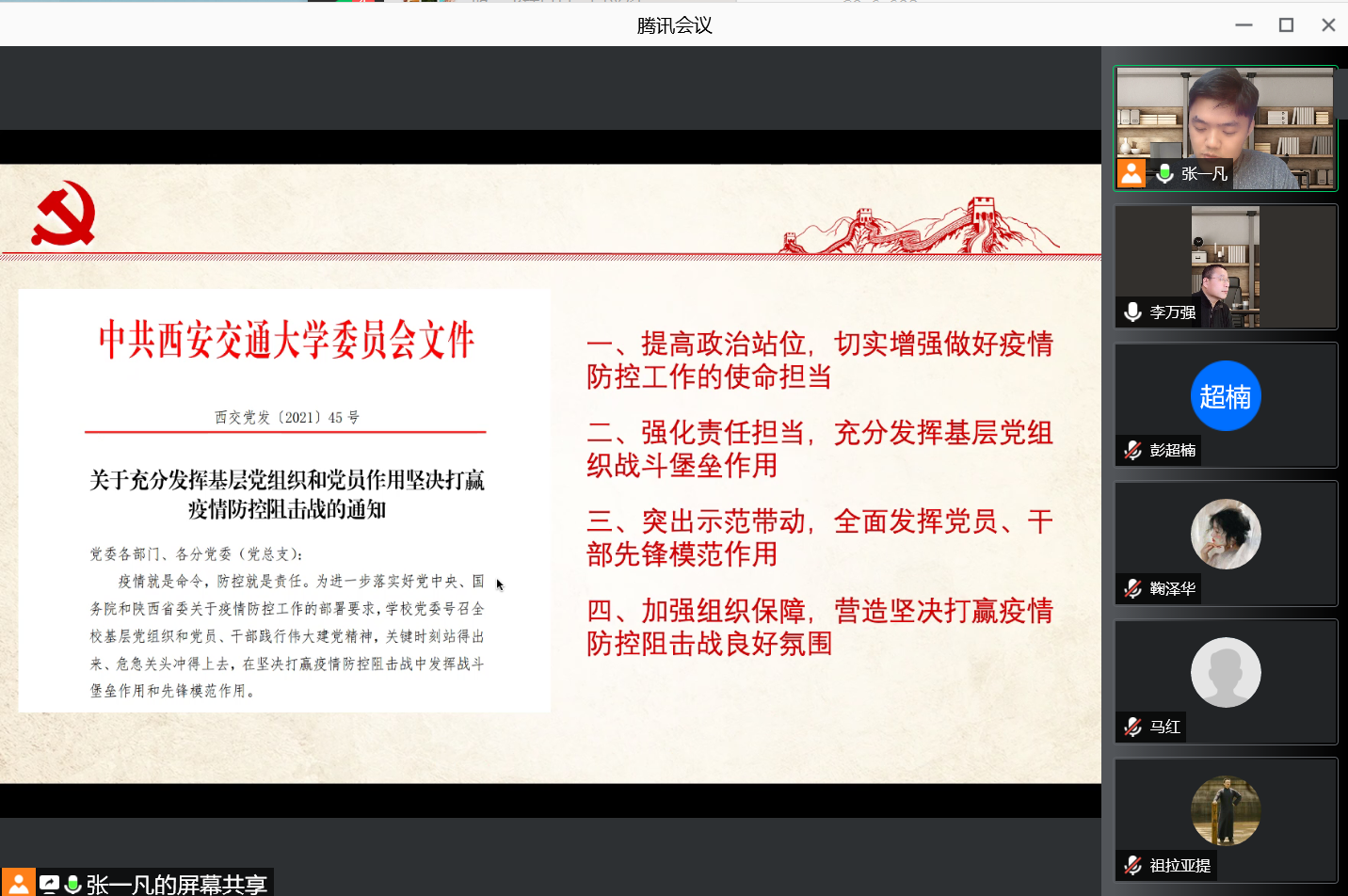 12月31日上午,球友会硕1173党支部召开线上组织生活会,深入学习落实上级党委关于疫情防控的相关文件精神。党支部成员及入党积极分子代表共计15人参与本次会议,球友会副院长李万强教授出席。会议由党支部书记张一凡主持。