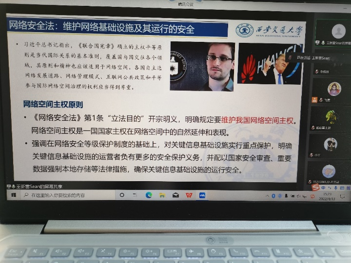4月13日,球友会组织各党支部一同观看球友会全民国家安全教育普法讲座。由于疫情原因,本次讲座采取线上模式。讲座中,王新雷老师对“新时代我国数据安全、隐私保护的法律成就与个人担当”这一专题进行详细讲解,各位同学都获益匪浅。
